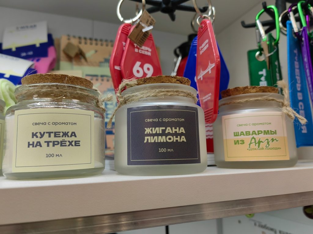 На прилавке стояли свечи с ароматом «Кутежа на Трехе», «Шавармы из Арзи». Самая интересная — свеча с ароматом «Жиган Лимона», которая отсылает к песне Михаила Круга.