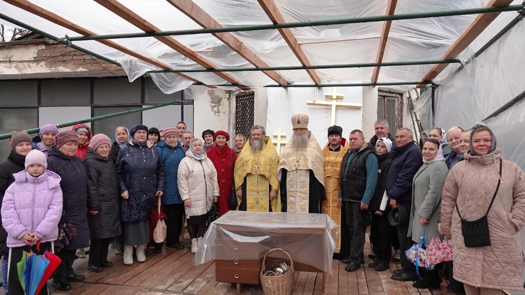 Отец Николай освятил два креста. Один подняли на колокольню, второй будет установлен над притвором.