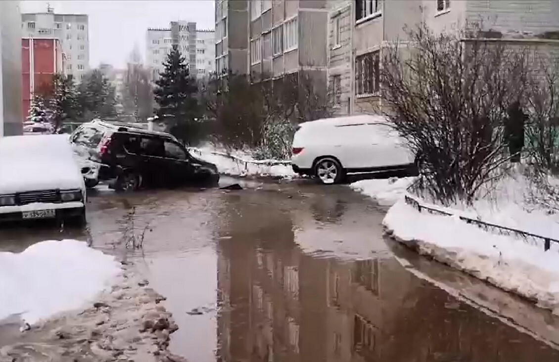 Как сообщил очевидец, рукотворное озеро во дворе образовалось из-за прорыва трубы холодного водоснабжения. В результате вода залила проезжую часть, до подъездов она не дошла. Впрочем, и этого хватило, чтобы двор оказался трудно проходимым для пешеходов.