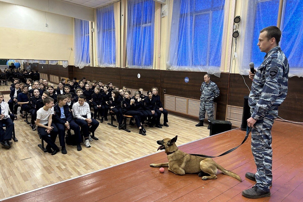 Встреча началась с просмотра тематического видеоролика о работе полицейских-кинологов. После этого кадеты познакомились с голландской овчаркой по кличке Алиса, которая продемонстрировала им навыки в обнаружении спрятанных предметов. Школьники с восторгом смотрели исполнение команд, выученных служебной собакой.
