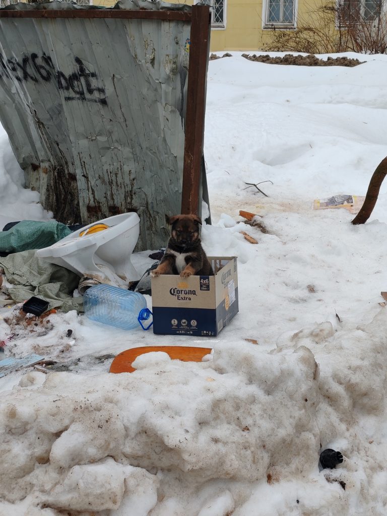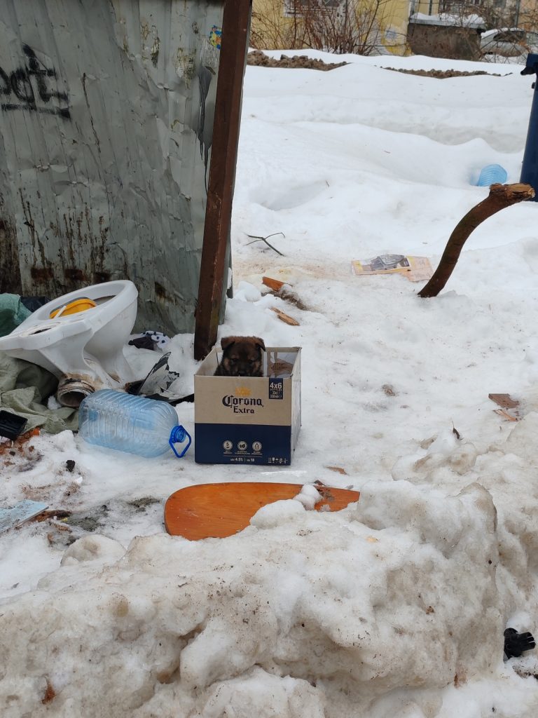 На помойке поперёк улицы Набережная Иртыша и Хромова кто-то выбросил породистого щенка в коробке. Об этом сообщили очевидцы в ВК-сообществе «Инициативная группа по защите животных».