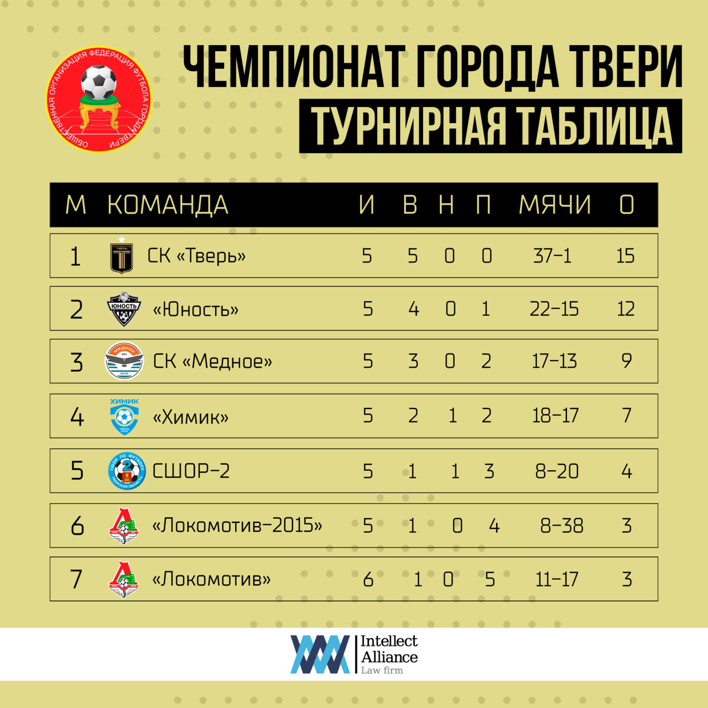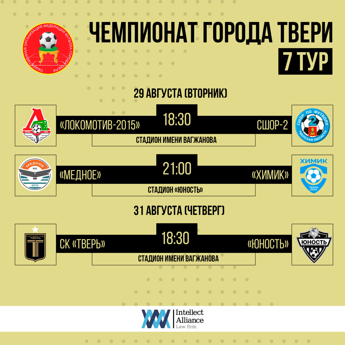 - Главный матч Чемпионата состоится в четверг 31 августа СК «Тверь» сыграет с «Юностью» на стадионе имени Вагжанова. В этом матче решится судьба золотых медалей Чемпионата города Твери.