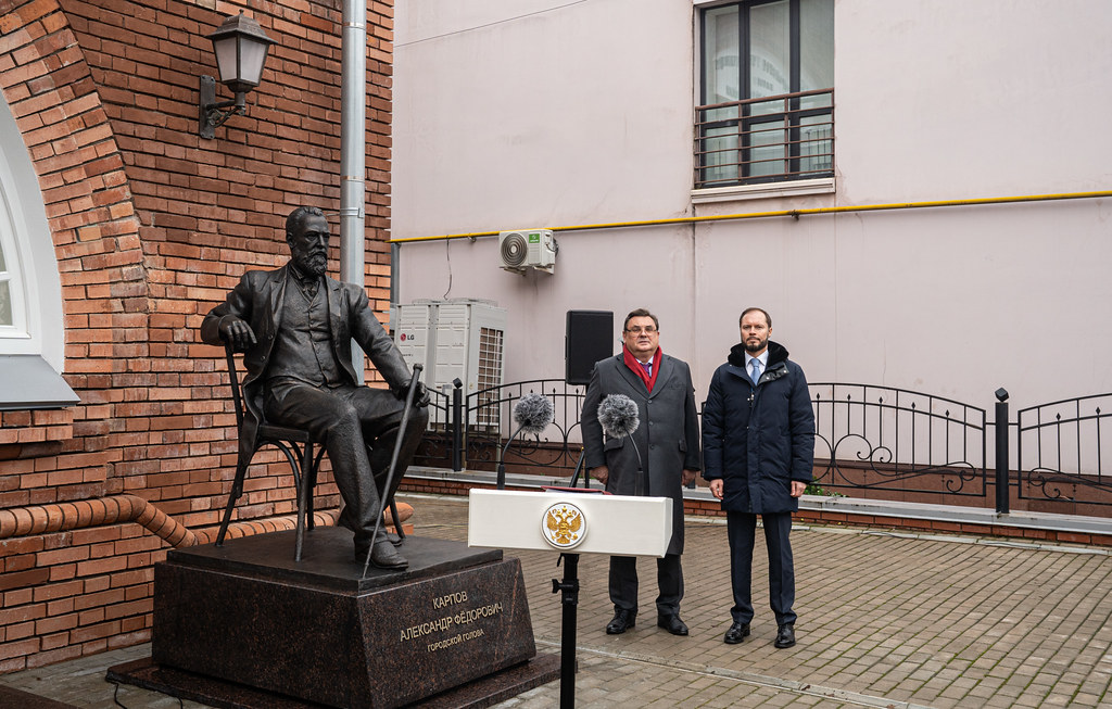 В центре Твери торжественно открыли памятник городскому голове Александру Федоровичу Карпову. Памятник расположен у здания бывшего начального земского училища, некогда носящего его имя. В настоящее время в этом здании расположено управление Минюста РФ по Тверской области.