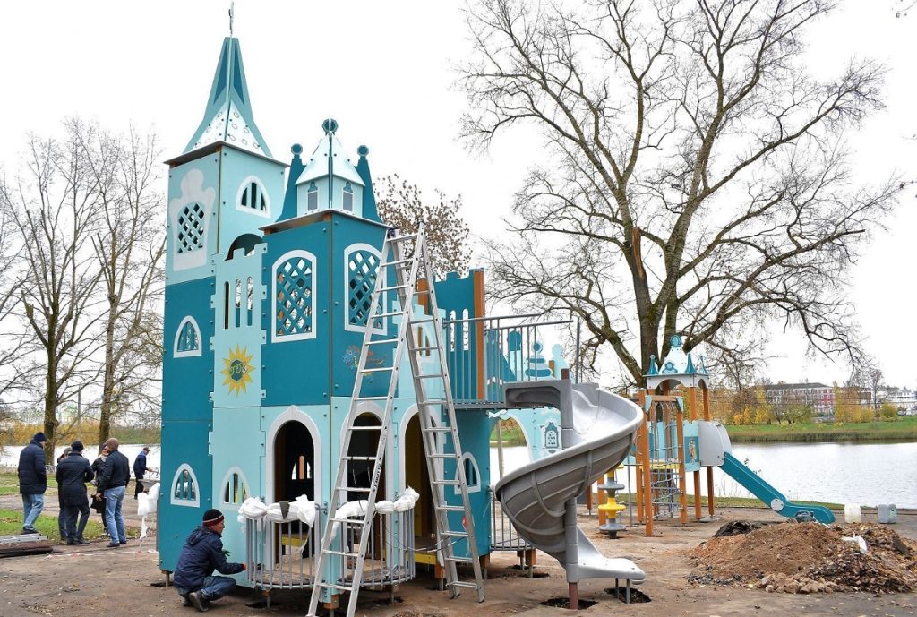 В Заволжском районе в зоне отдыха на набережной Афанасия Никитина завершается установка детского замка «Солнечный город», двухсекционных качелей и игрового комплекса «Корабль».
