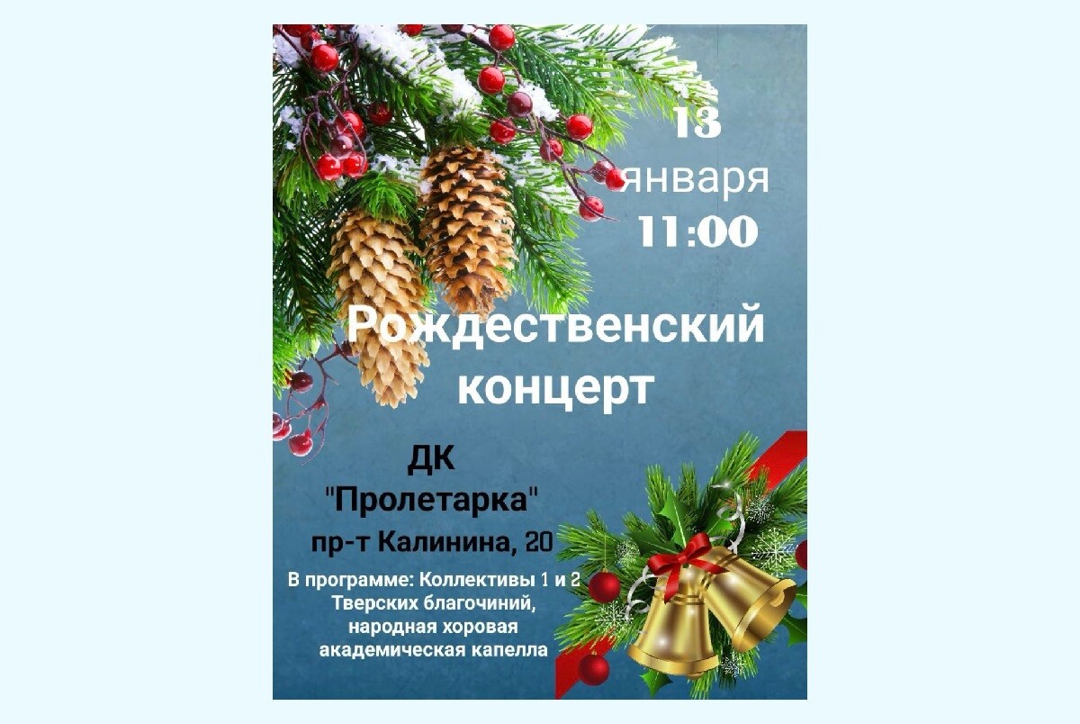 Большой рождественский концерт в ОДК «Пролетарка» начнется в 13 часов. Его участниками станут творческие коллективы дворца культуры, в том числе Народная хоровая академическая капелла, и воспитанники воскресных школ Твери.
