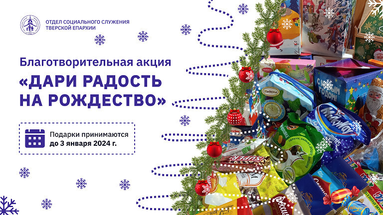 Благотворительная акция «Дари радость на Рождество» направлена сбор подарков для детей из многодетных и нуждающихся семей, детей-инвалидов, а также для тех, кто лишен внимания и заботы: пожилых одиноких людей, детей-сирот, бездомных, подопечных социальных и медицинских учреждений. Ее организатором выступает отдел социального служения Тверской епархии. В прошлом году подарки в рамках акции получили более 800 человек.