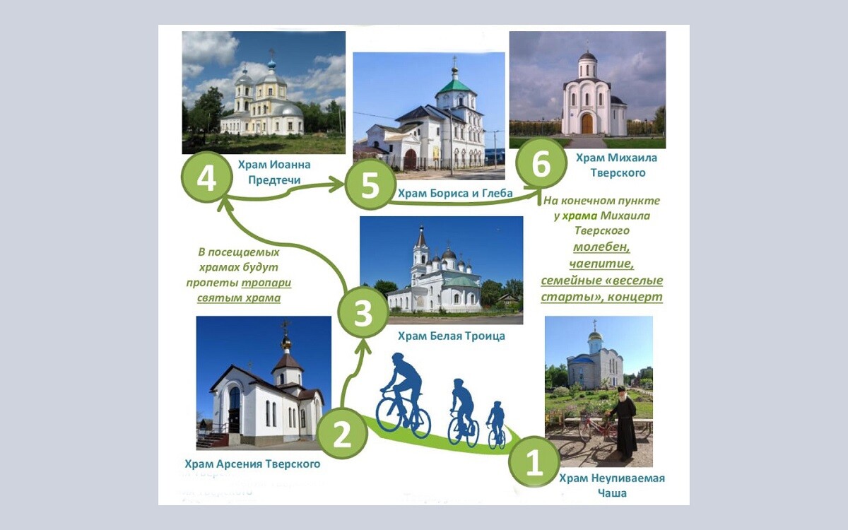 Как сообщили в Тверской епархии, велопробег направлен на популяризацию здорового и трезвого образа жизни. Его участников ждут в 11:45 в микрорайоне Южный у храма «Неупиваемая Чаша». Старт велопробега назначен на полдень. Маршрут проложен мимо тверских храмов в честь святителя Арсения Тверского, «Белая Троица», в честь пророка Иоанна Предтечи, в честь святых Бориса и Глеба. Велопробег завершится у храма в честь Михаила Тверского.