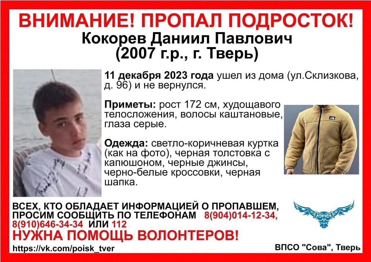 Всех, кому известно, где находится Даниил Кокорев, просят сообщить об этом в следственное управление Следственного комитета РФ по Тверской области по телефону: 8-(930)-179-00-69.