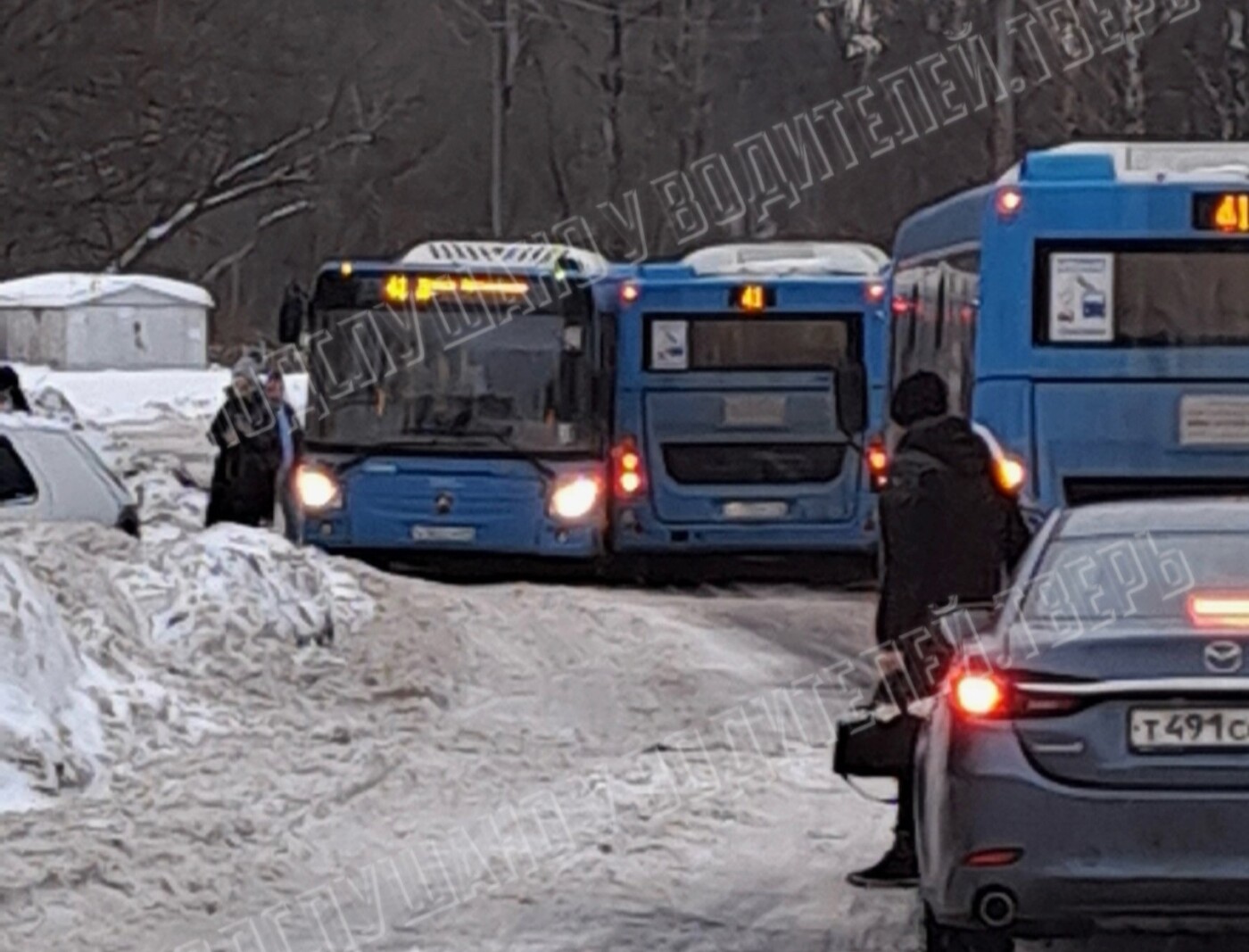 ДТП произошло на конечной остановке. Судя по всему, водители автобусов пытались разъехаться по узкой дороге, но этому не суждено было случиться из-за снега и, возможно, наледи. В итоге, два автобуса маршрута 41 выбыли из игры.