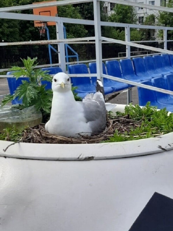 Интересная новость пришла из города Конаково Тверской области: одна из местных чаек решила, что лучшее место для высиживания птенцов – это стадион.