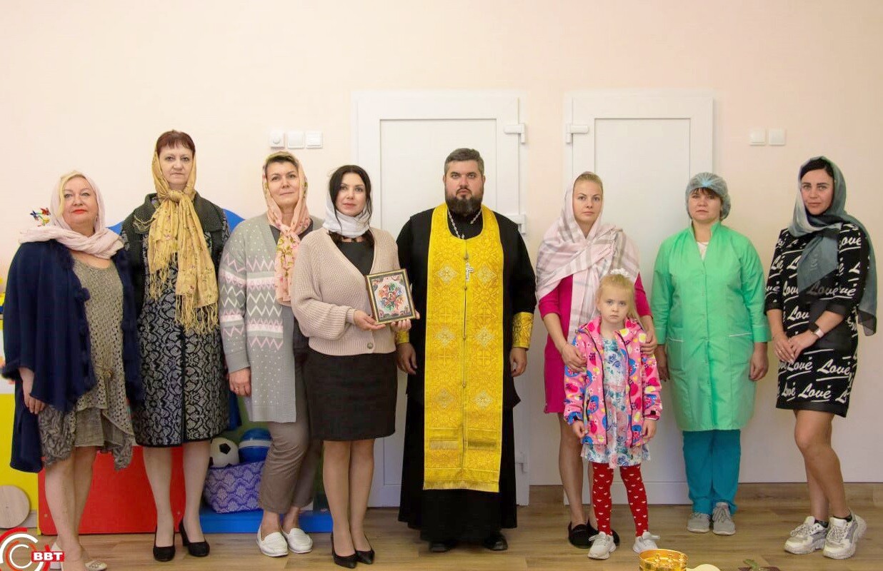 Священник окропил святой водой не только группы, но и остальные помещения «Теремка»: хозблоки, актовый зал и прогулочные участки. После этого он благословил коллектив дошкольного учреждения и подарил детсаду икону Божьей Матери «Неопалимая Купина».
