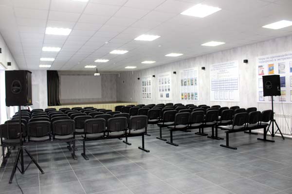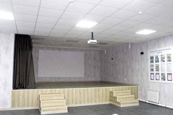Для зрителей установлены новые ряды кресел. На окнах повешены жалюзи, на стенах – информационные стенды, сцену отделяет от зрителей занавес.