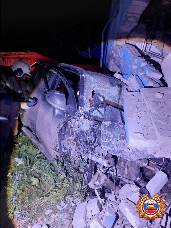 От удара угол здания оказался поврежден и крупные куски кирпичной кладки обрушились на покореженный автомобиль.