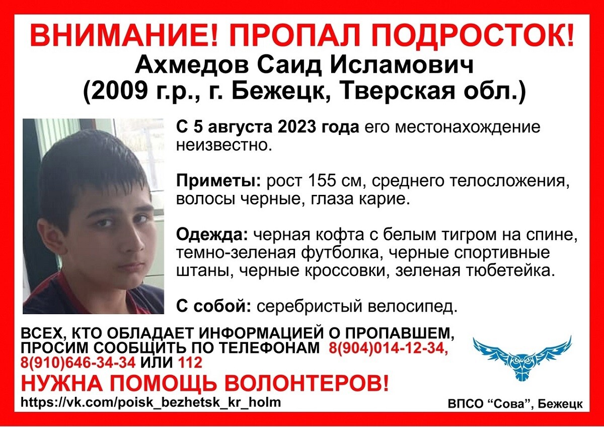 13-летний житель Бежецка Саидислам Ахмедов пропал 5 августа. Мальчик ушел из дома и исчез. Через два дня обеспокоенные родные обратились за помощью в правоохранительные органы.