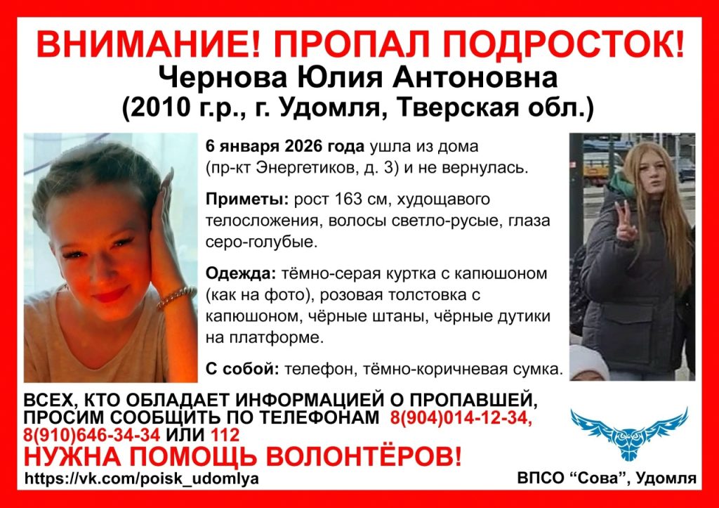 Пропала Чернова Юлия Антоновна 2010 года рождения в городе Удомля. 6 января 2026 года девочка ушла из дома (проспект Энергетиков, дом 3) и не вернулась.
