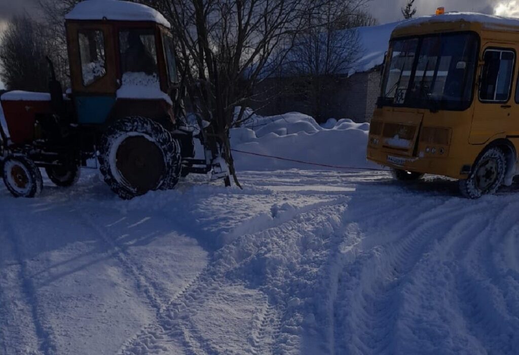 Школьный автобус, который собирал детей, чтобы везти в школу, застрял в снегу на дороге между деревнями Большое Петрово и Рамушки.