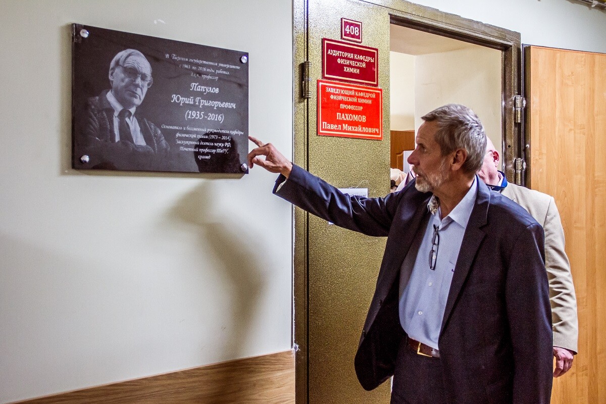 Открытие мемориальной доски профессору Юрию Папулову было приурочено к 50-летию кафедры физической химии, основателем и бессменным руководителем которой он являлся.