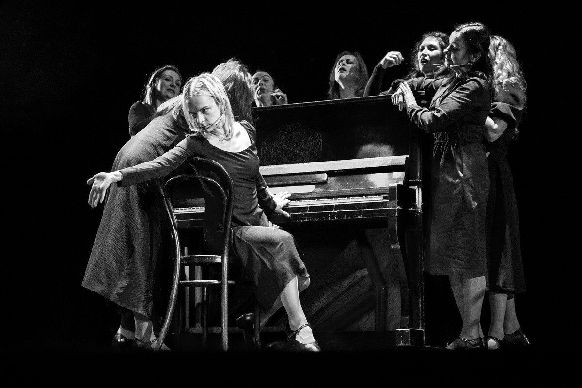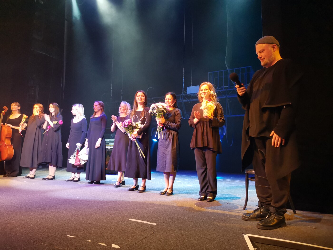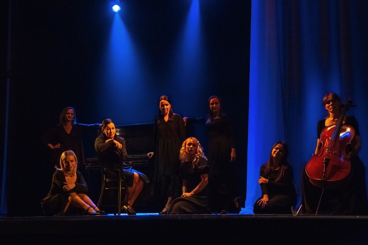 Вначале постановки Виталий Салтыков интригующе заявил, что спектакль некукольный, но актрисы используют свое мастерство, наработанное за годы кукольных постановок. В театре всего 16 актеров, в том числе 10 женщин. На сцену вышли восемь из них: Екатерина Матвеева, Ольга Брузе, Александра Колючая, Ирина Сыряева, Софья Хорошавина, Анастасия Курапова, Елена Шамарина и Валентина Дерко. На сцене весь спектакль находится еще одна женщина – виолончелистка Дарья Степанова, выпускница Санкт-Петербургской Консерватории им. Н.А.Римского-Корсакова. Под аккомпанемент живой музыки звучат многие истории.