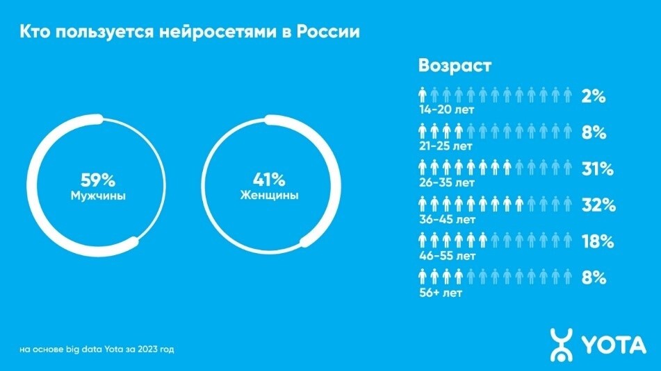 По сравнению с периодом январь – октябрь прошлого года посещаемость сервисов по работе с ИИ в этом году выросла в 3,5 раза. Основные пользователи нейросетей – люди в возрасте 36–45 лет (на них приходится 32% аудитории), а также 26–35 лет (31%). На третьем месте – абоненты 46–55 лет (18%).