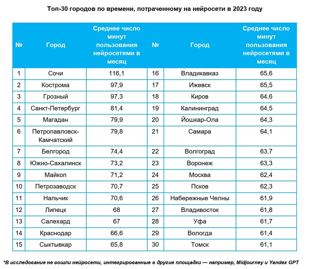 Кроме того, аналитики Yota составили топ городов, жители которых тратят на нейросети больше всего времени. Рейтинг возглавил Сочи, где в среднем абонент пользуется нейросетями почти два часа в месяц (116 мин). Также в пятерку лидеров вошли Кострома, Грозный, Санкт-Петербург и Магадан.