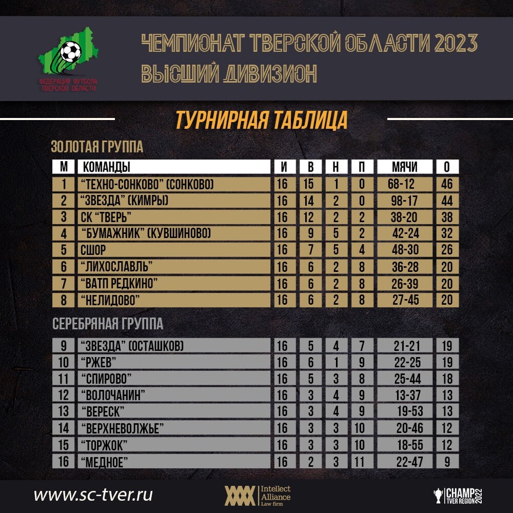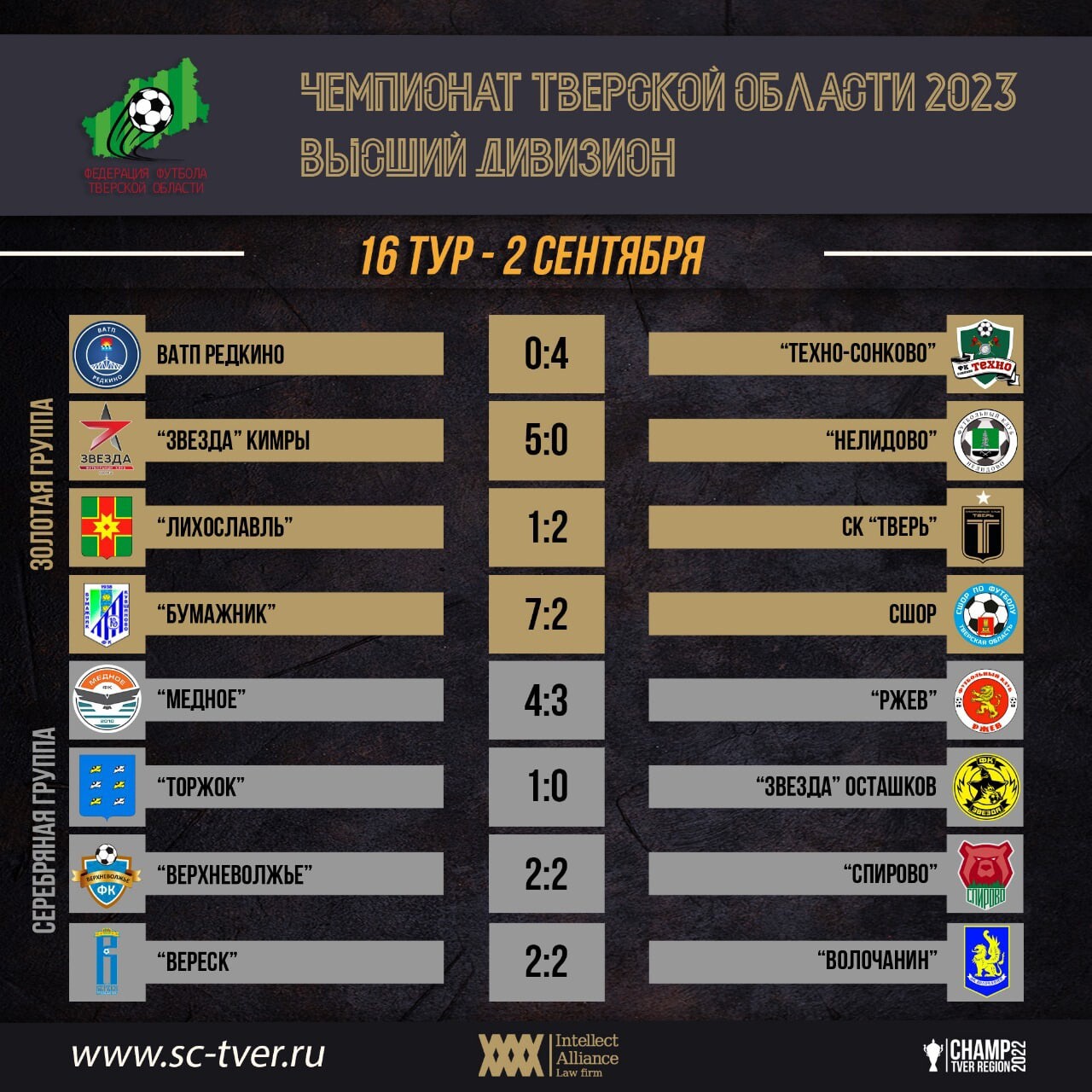 По результатам матчей 16-го тура Чемпионата Тверской области, шестёрка лидеров Золотой группы осталась на своих местах. В Серебряной группе осташковская «Звезда», несмотря на поражение, поднялась на первое место.