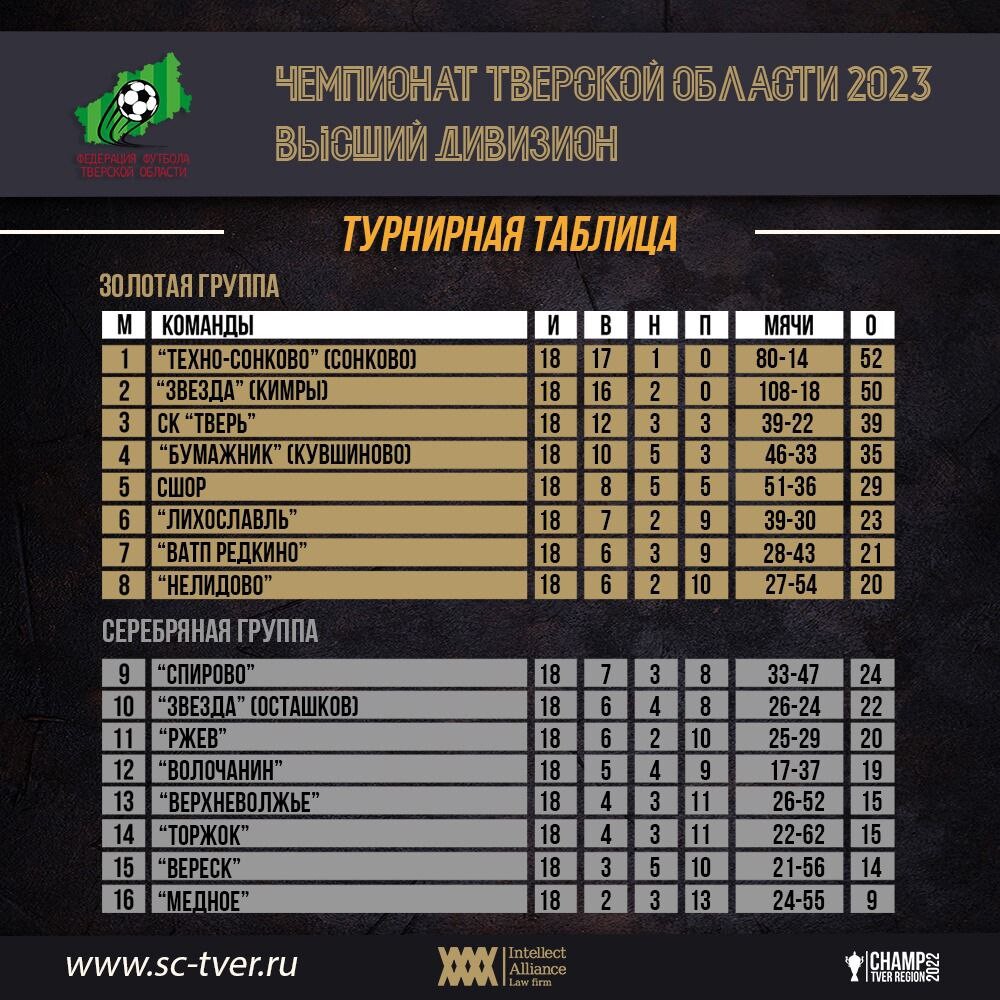 По результатам матчей 18-го тура Чемпионата Тверской области, СК «Тверь» потерял шансы на чемпионство, так как отрыв «Техно-Сонково» от третьего места теперь составляет 13 очков. Сонковчане и кимряки разыграют золото и серебро между собой. Внизу турнирной таблицы располагаются «Медное», «Вереск», «Торжок» и «Верхневолжье», которые борются за выживание.