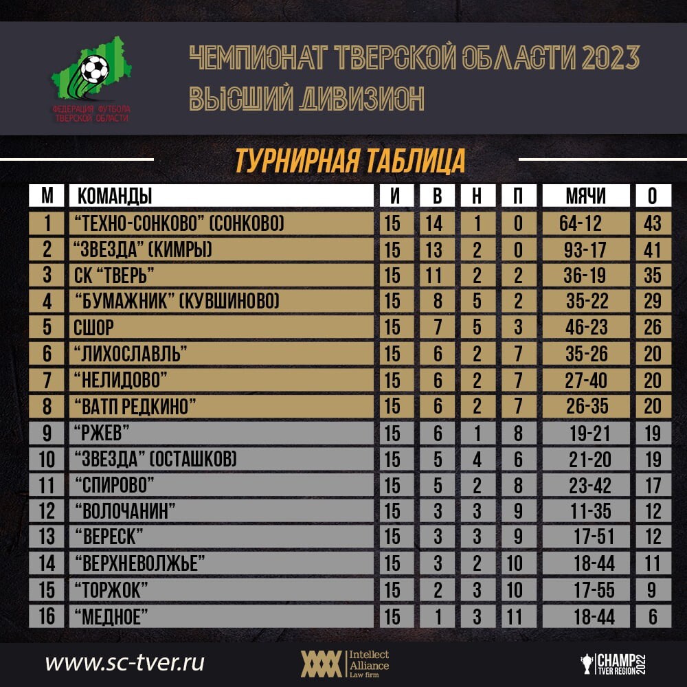 Турнирная таблица после первого этапа Высшего дивизиона Чемпионата Тверской области выглядит следующим образом:
