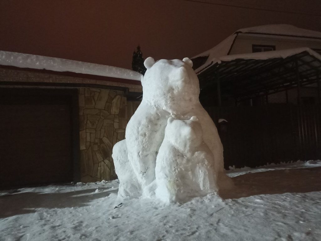 На улицах у Сырзавода в городе из снега слепили медведя с медвежонком и еще много различных фигур: несколько елочек, снежный трон.
