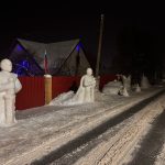 На улицах у Сырзавода в городе из снега слепили медведя с медвежонком и еще много различных фигур: несколько елочек, снежный трон.