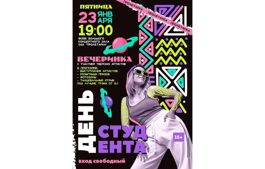 Сегодня студентов областной столицы ждут в ДК «Пролетарка» на празднование Дня студента (16+). С 19.00 для гостей вечеринки выступят молодые тверские артисты, а также DJ SATORU. В течение вечера пройдут розыгрыши призов, фотозоны и фототочки с моментальной печатью.