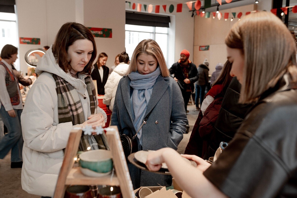 Любителей стильных образов порадуют украшения из натурального жемчуга, японского бисера и эпоксидной смолы, а также теплые варежки из натуральной шерсти, платья и аксессуары от локальных дизайнеров.