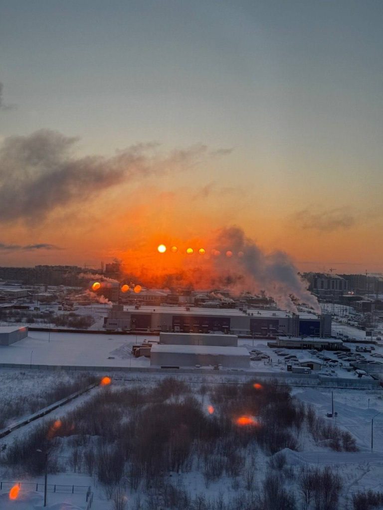 Из-за мороза, влажности и ясного неба ледяные кристаллы преломили свет, создав эффект нескольких солнечных дисков. Многие жители города стали фотографировать удивительное явление и делится им в социальных сетях.