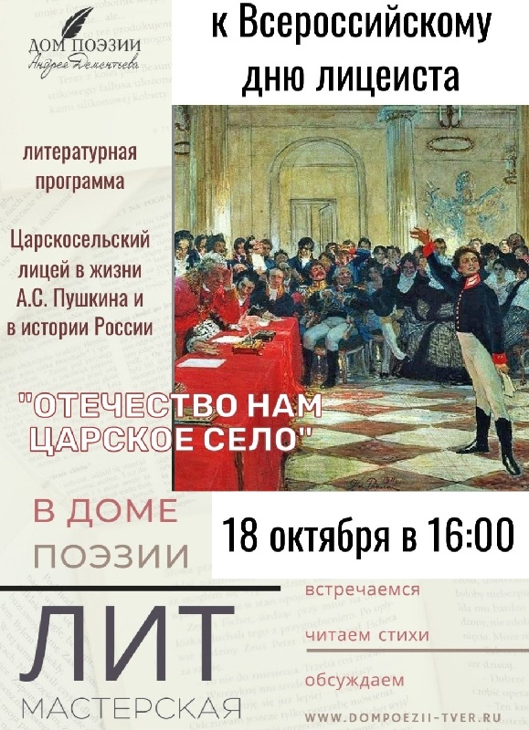 19 октября отмечается Всероссийский день лицеиста. В преддверии памятной даты в Твери в Доме поэзии Андрея Дементьева состоится литературная программа «Отечество нам Царское Село». Ее проведет поэт член Союза писателей России Василий Рысенков.